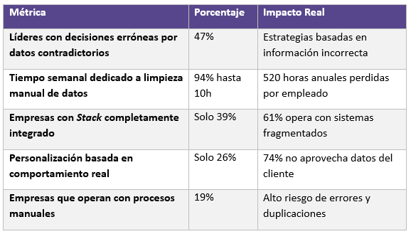 Una de las principales causas de la desconexión de datos es la fragmentación del stack tecnológico. Solo el 39% de las empresas cuenta con un sistema completamente integrado, mientras que el 61% opera con sistemas fragmentados que dificultan la consolidación y análisis de datos. Esta fragmentación genera silos de información, duplicaciones y errores que afectan la calidad de los datos y, por ende, la toma de decisiones.