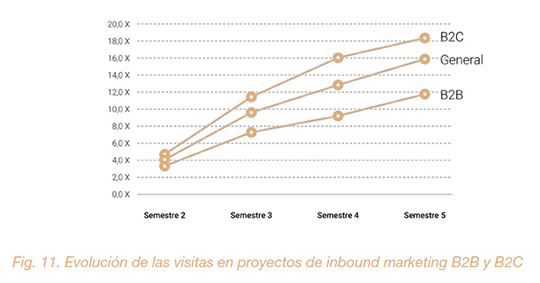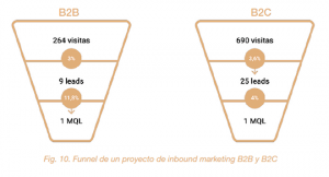 Las empresas orientadas al B2C compensan la menor conversión –de media, 1 MQL por cada 690 visitas– con un mayor crecimiento de las visitas, casi do-blando el ritmo de las empresas B2B.